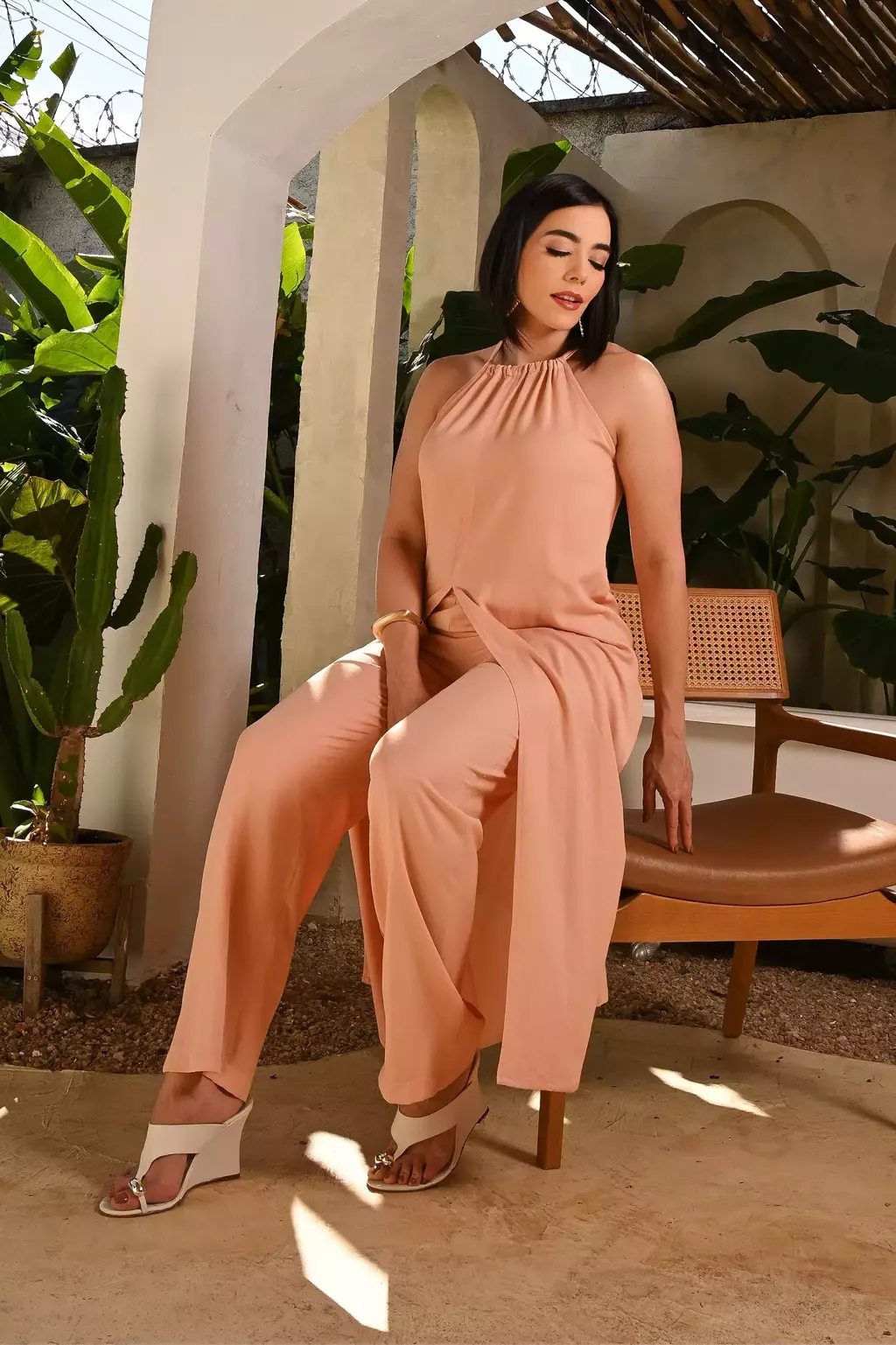 A calça com forro 100% poliéster oferece conforto e leveza, enquanto a blusa longa completa o visual com elegância. Disponível nos tamanhos P (38), M (40) e G (42), e nas cores Verde e Pêssego.